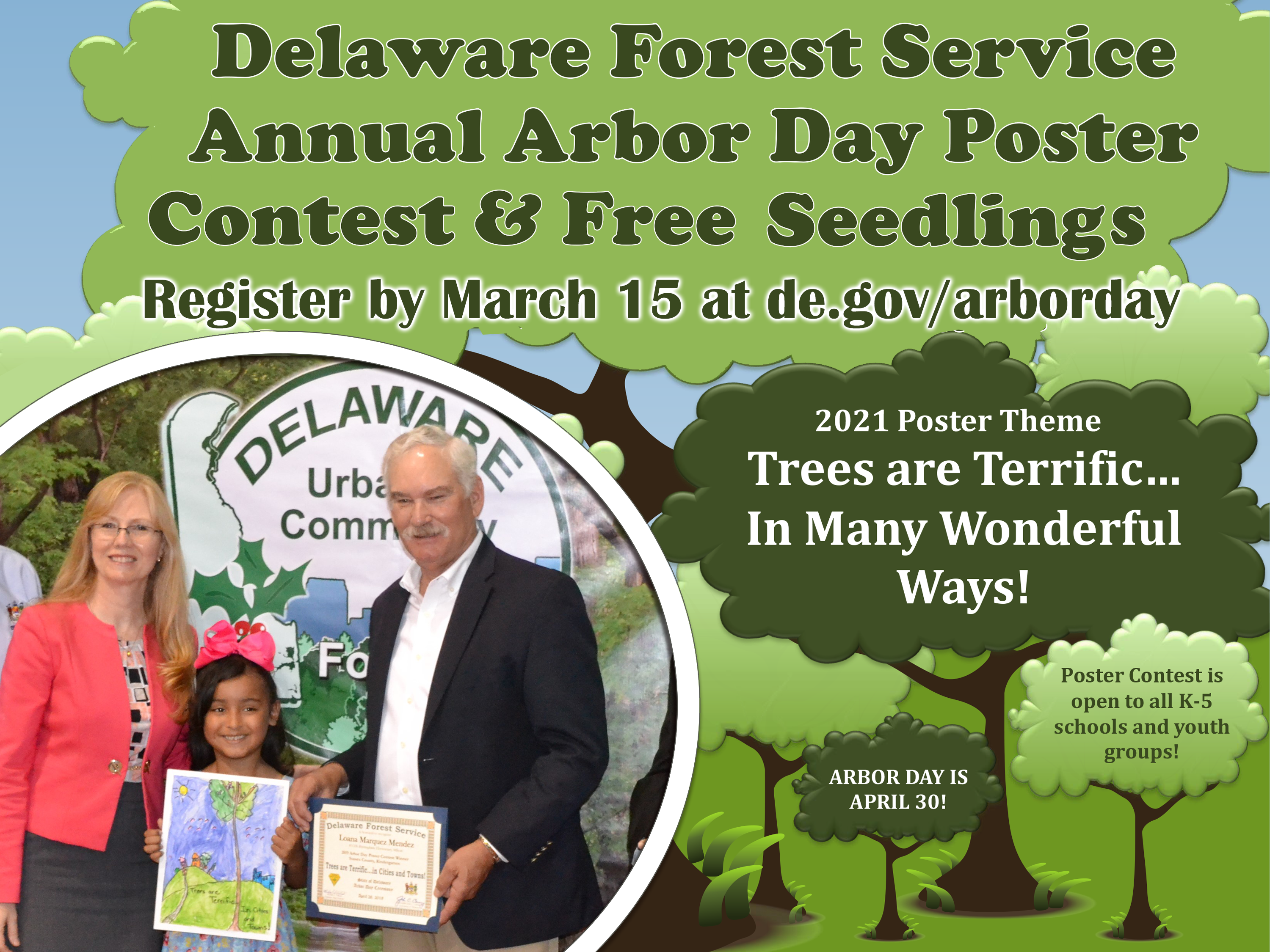 DOVER — The Delaware Forest Service is seeking entries for its annual “Arbor Day School Poster Contest” – open to students in grades K to 5 from all Delaware public, private, home school, after-school, and other organized youth groups. Winning posters will be selected from each of the three counties in the following categories: kindergarten, grades 1 and 2, grades 3 and 4, and grade 5. The twelve winners will be recognized at the annual Statewide Arbor Day Celebration and receive a tree planting ceremony at their school to celebrate Arbor Day.